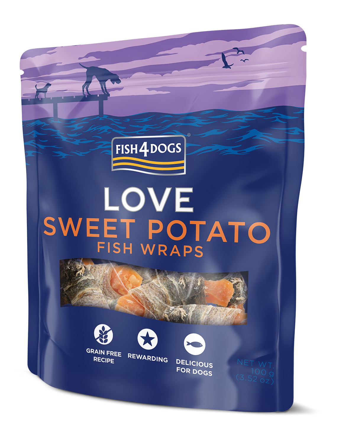 Laget av søtpotet innpakket i fiskeskinn. Søtpotet er en fantastisk grønnsak som inneholder lite kalorier (gjennomsnittlig 7 kalorier per godbit) og er rik på kalium og vitamin A. Søtpoteter er perfekt tilbehør til fisk og gir sunne, deilige godbiter du kan gi med god samvittighet.