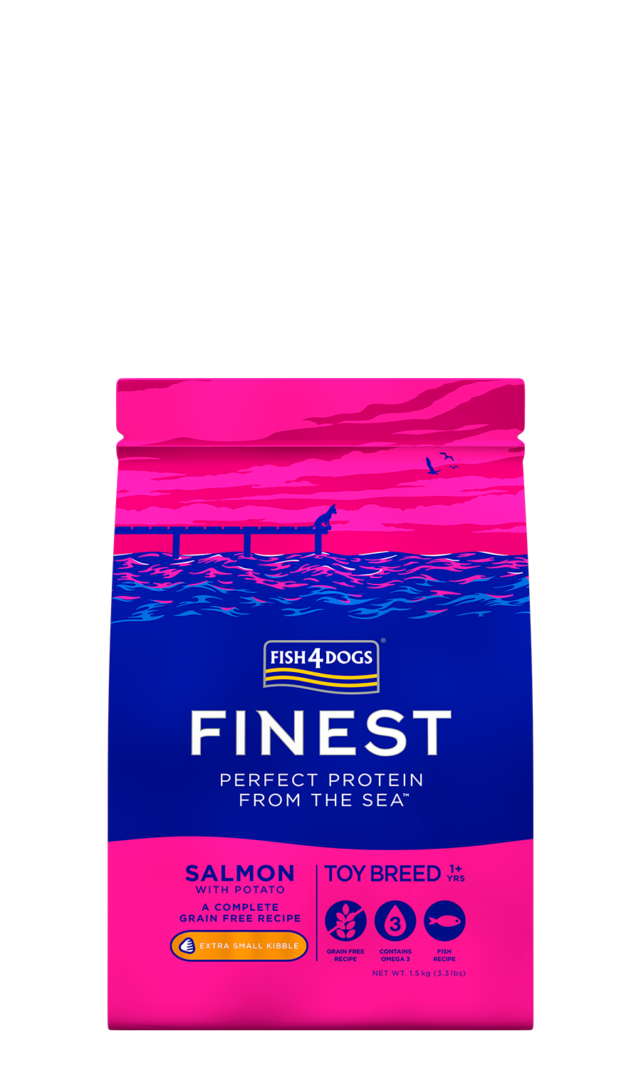Finest TOY Breed produktet inneholder laks som hovedkilde til fett og protein, og er tilpasset hunder av liten størrelse. Resepten er nøye justert etter voksne hunder av liten størrelse sitt ernæringsmessige behov. Størrelsen på knottene er også tilpasset små hunder, og måler ca. halv størrelse av knottene i resten av finest serien av som heter små biter. Den høye verdien av omega 3 fra marine kilder er ypperlig for ledd, hud, pels og hjerneutvikling. Produktet er kornfritt og inneholder ingen kunstige tilsetningsstoffer eller fargestoffer. Kilden til karbohydrater er potet og erter.