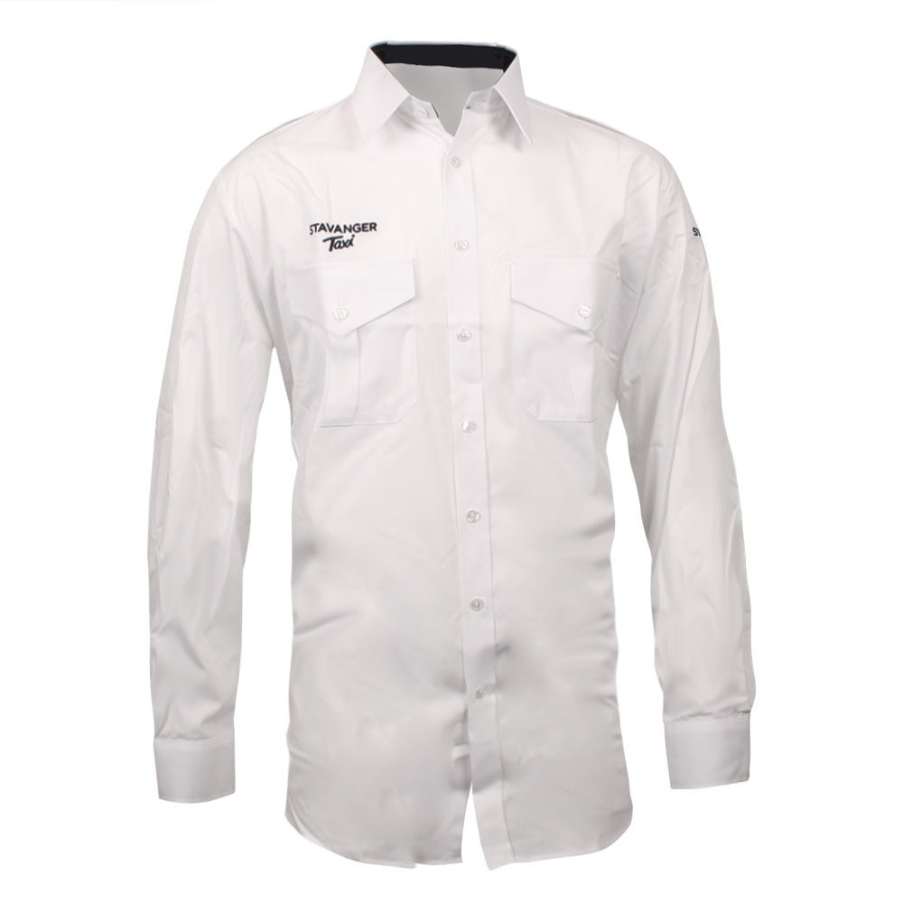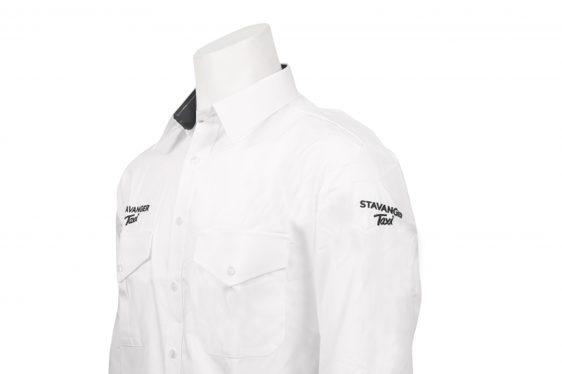 Hvit langarmet skjorte til herre. Stavanger Taxi logo brodert på høyre bryst og på venstre arm.