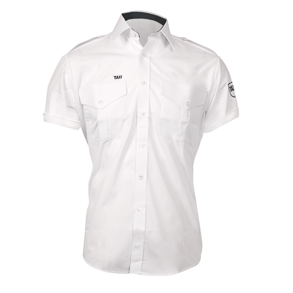 Hvit herreskjorte med kort arm. Taxi brodering i sort.
