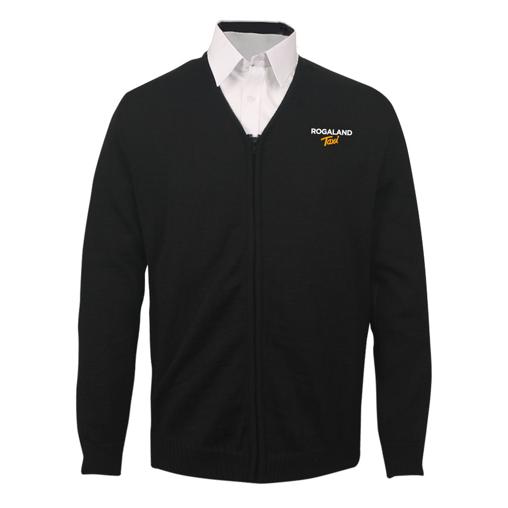 Strikket genser med glidelås. Brodert Rogaland Taxi logo på venstre bryst.